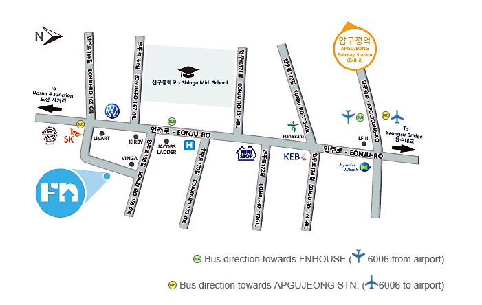 Subway: Apgujeong Station (Line 3, Exit 2)